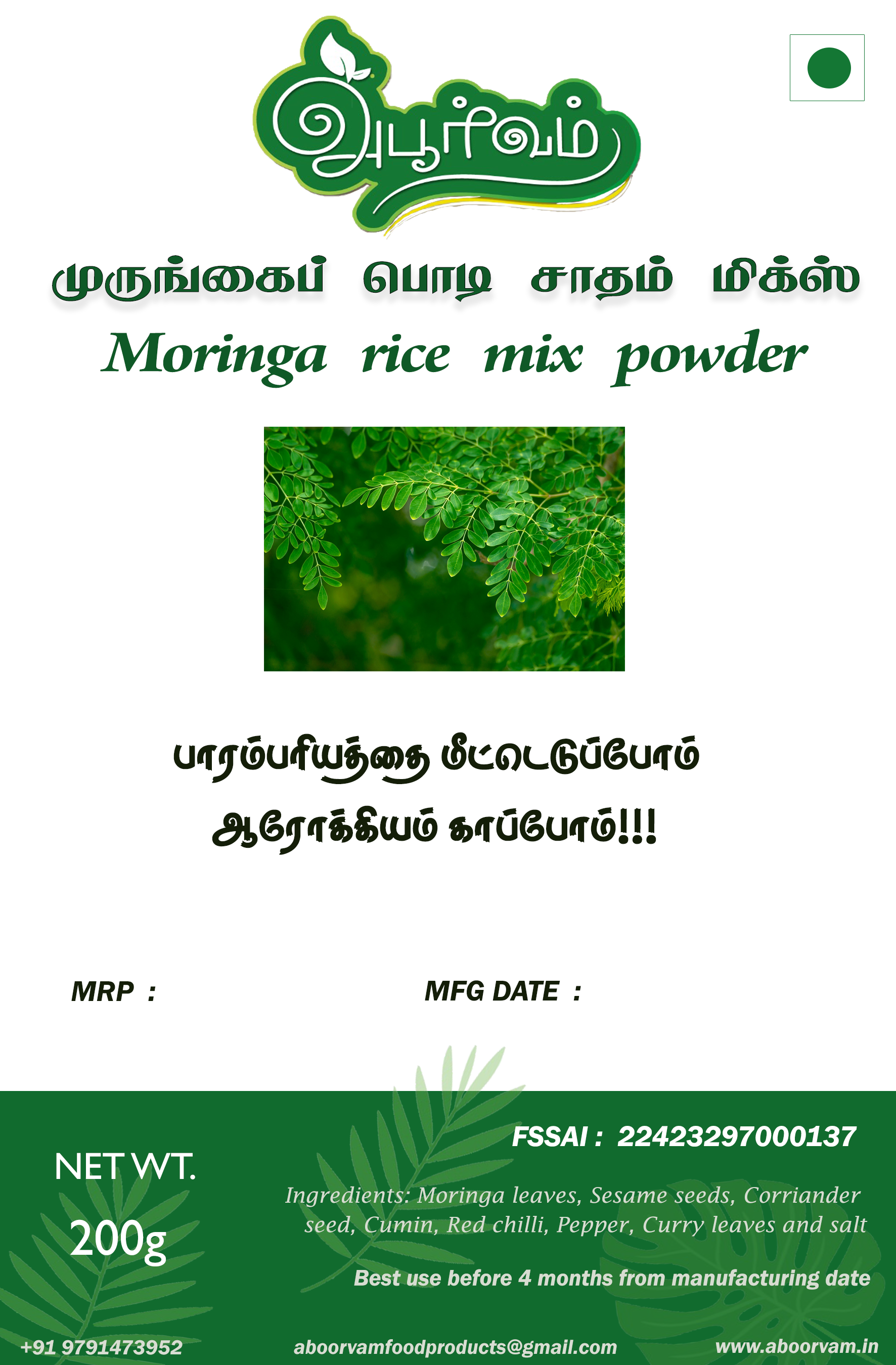 Experience the vibrant flavors and time-honored wisdom of South Indian tradition with Aboorvam’s Muringa Leaves Rice Mix Powder. This aromatic blend is crafted from handpicked muringa leaves, coriander seeds, cumin, red chilies, black pepper, and salt—roasted and ground to perfection. Ideal for mixing with hot rice and ghee or oil, this instant spice mix transforms a humble meal into a wholesome, flavorful delight. With its rich aroma and earthy taste, it offers a convenient way to enjoy the health benefits of curry leaves in everyday cooking.